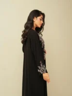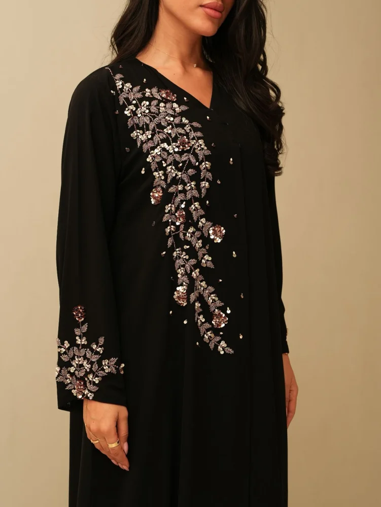التفاصيل :عباية قماش دبل شيفون مع شغل خرز امامي وعالاكمام.