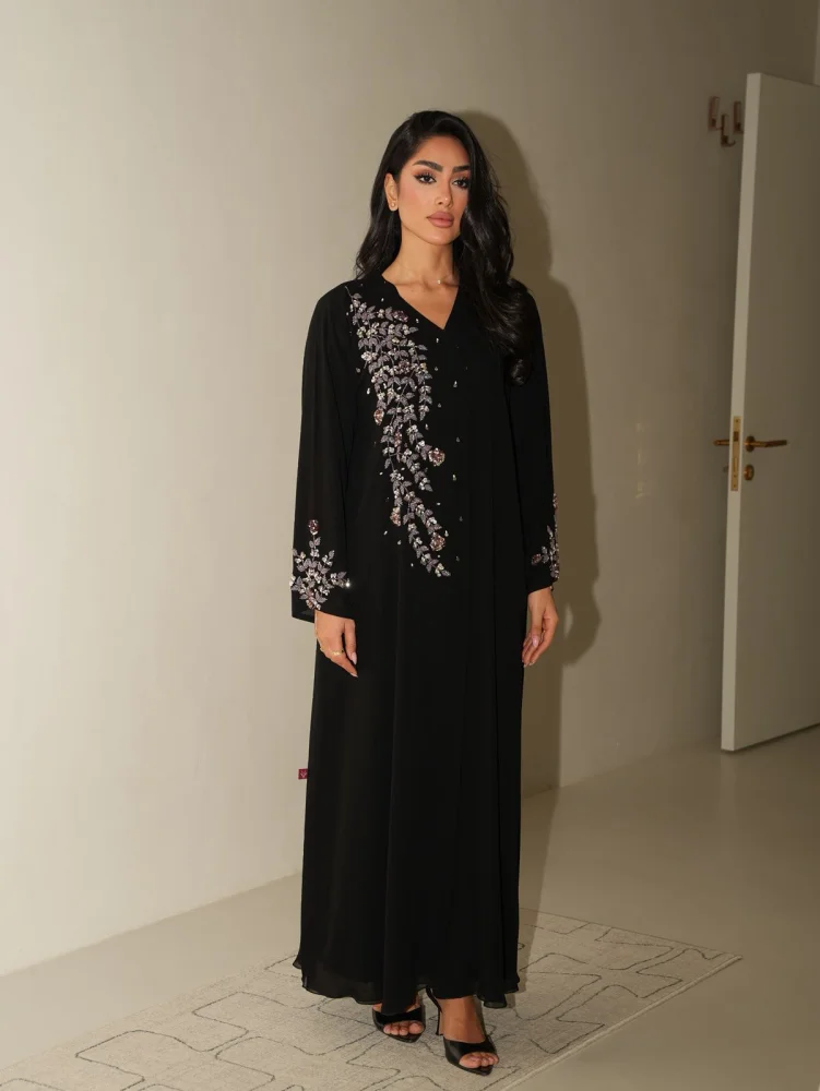 التفاصيل : عباية قماش دبل شيفون مع شغل خرز امامي وعالاكمام.