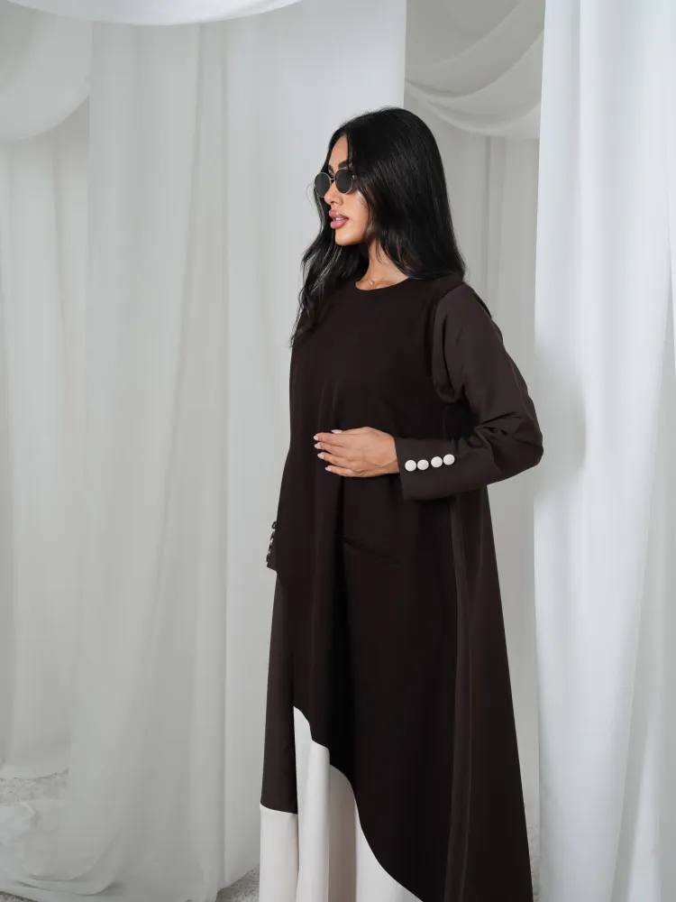 Aالتفاصيل: عباية بقماش باربي لون بني وبيج قصة